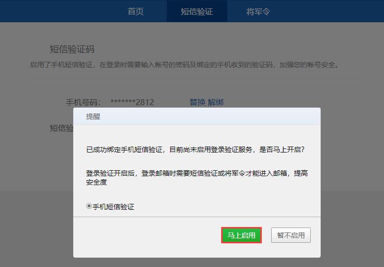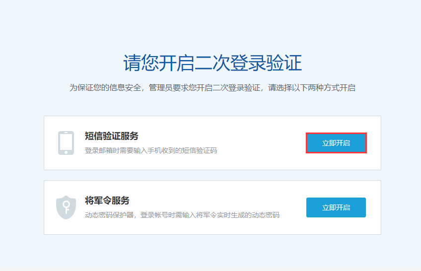 首次登陆时会提醒开启二次登陆验证,选择短信验证服务点击立即开启。